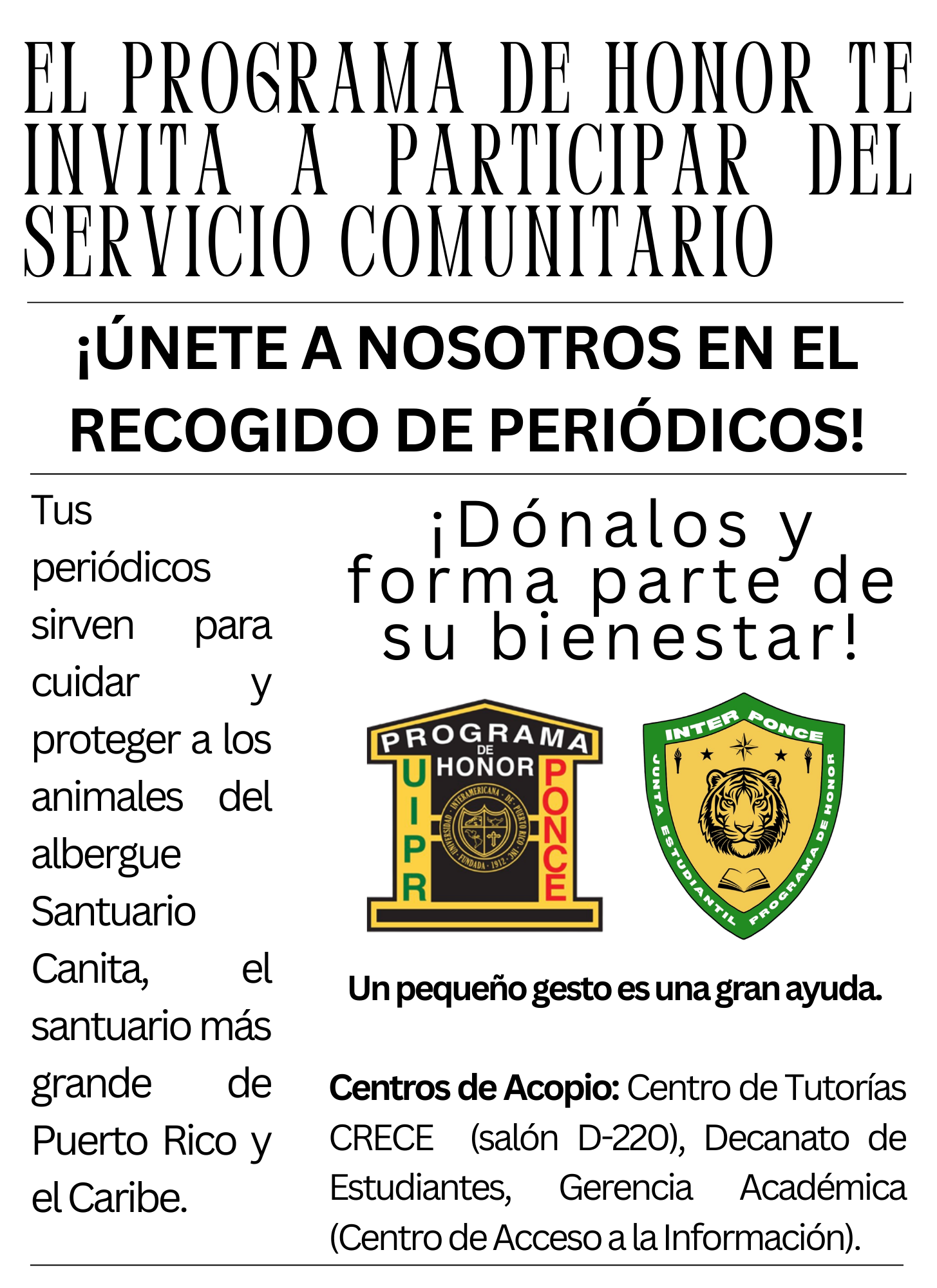 El Programa de Honor te invita a participar del Servicio Comunitario recogiendo periódicos que pueden ser reutilizados en el albergue de animales Santuario Canita. Esta actividad se estará llevando a cabo durante todo el semestre. Lleva tus periódicos a los centros de acopio que aparecen en esta publicación.