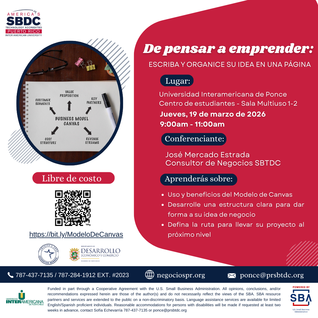 Podrá aprender sobre el uso y beneficio del Modelo Canvas, desarrollar una estructura clara para dar forma a su idea de negocio e ir definiendo la ruta para llevar su proyecto al próximo nivel.