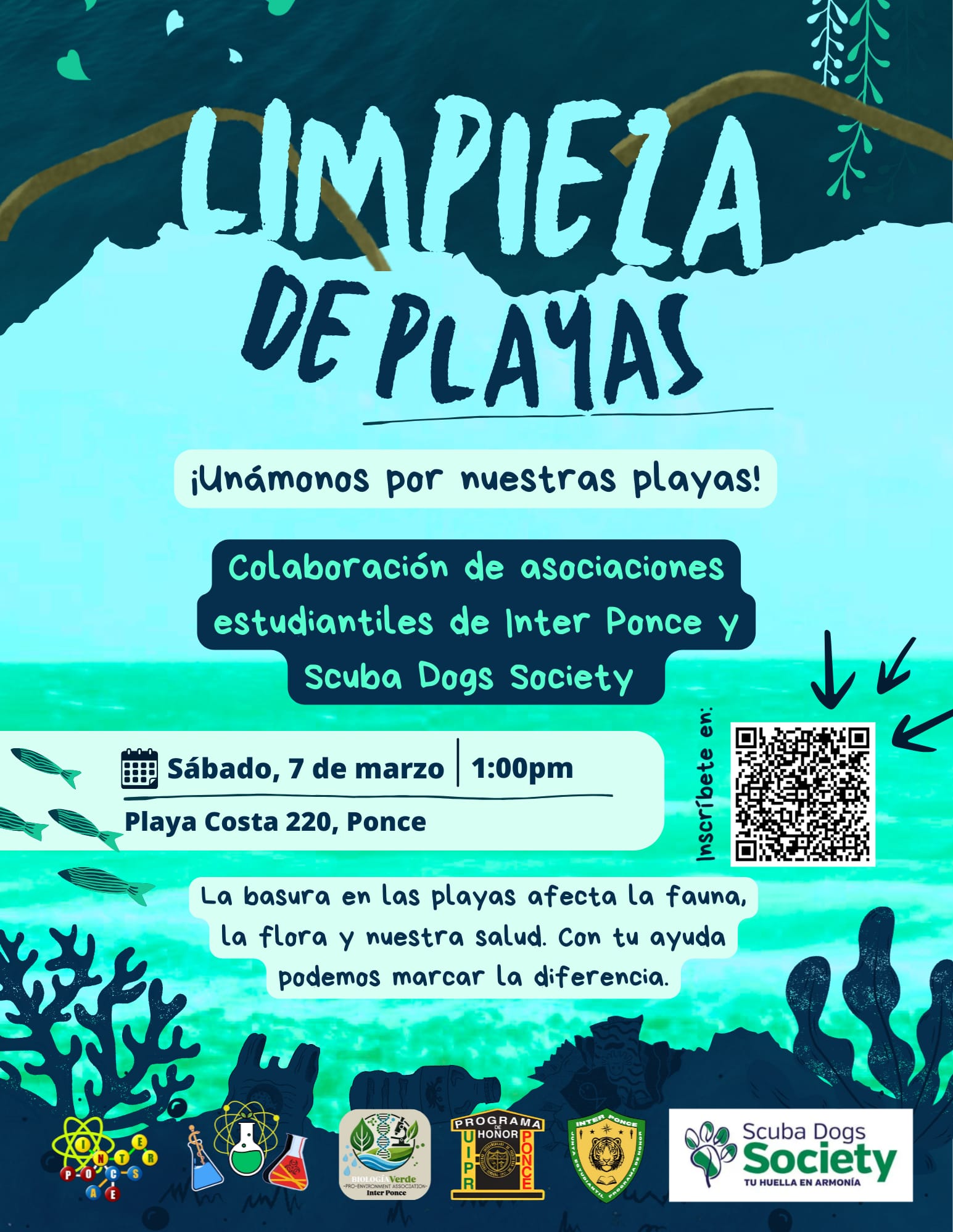 Asociaciones Estudiantiles de Inter Ponce y Scuba Dog Society se unen por nuestras playas.