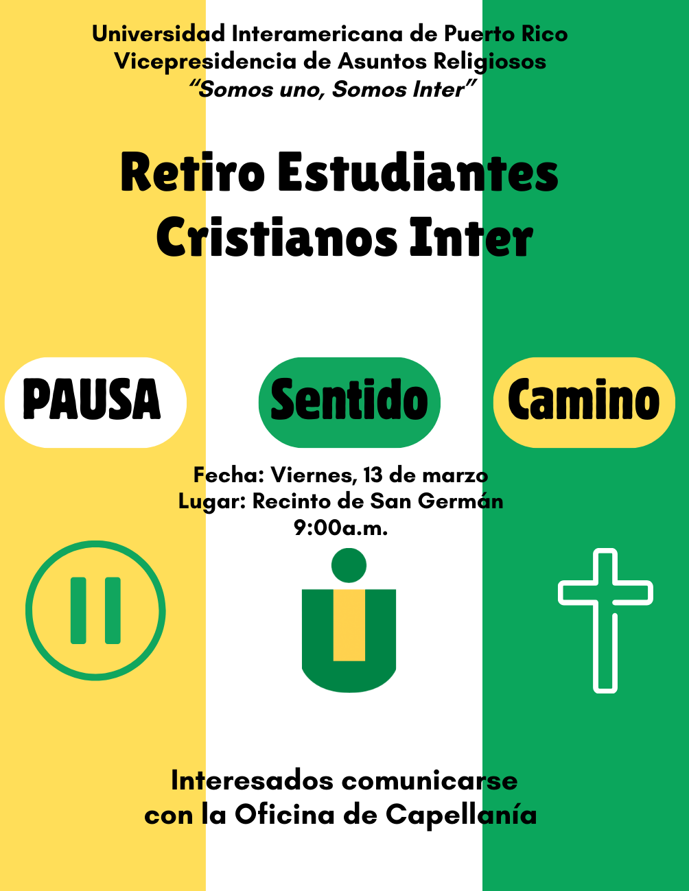 Retiro Espiritual para nuestros estudiantes. Un espacio de reflexión, crecimiento espiritual y convivencia con estudiantes de otros recintos. Será también una experiencia enriquecedora para fortalecer la comunidad universitaria y fomentar nuevas conexiones.